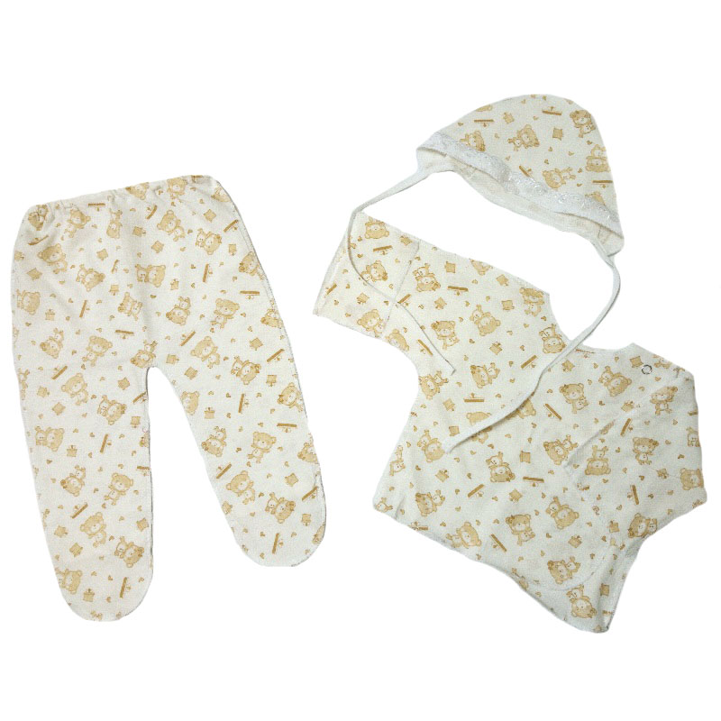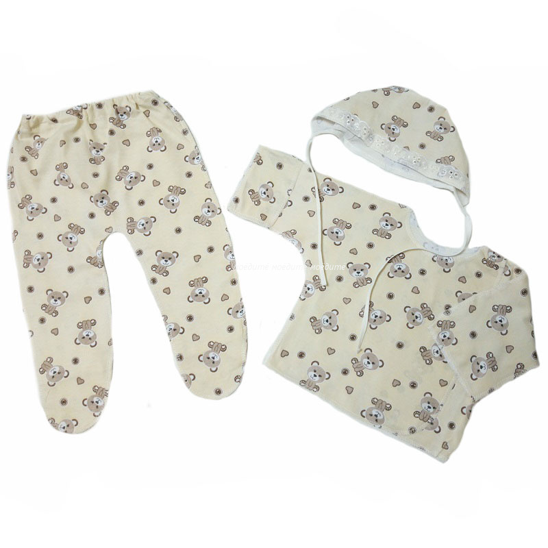 Комплект состоит из распашонки с рукавчиками трансформерами и с кнопочкой на одной стороне, ползунков на резинке, чепчика. Все швы у набора выполнены наружу. Рисунки в каждой партии отличаются.