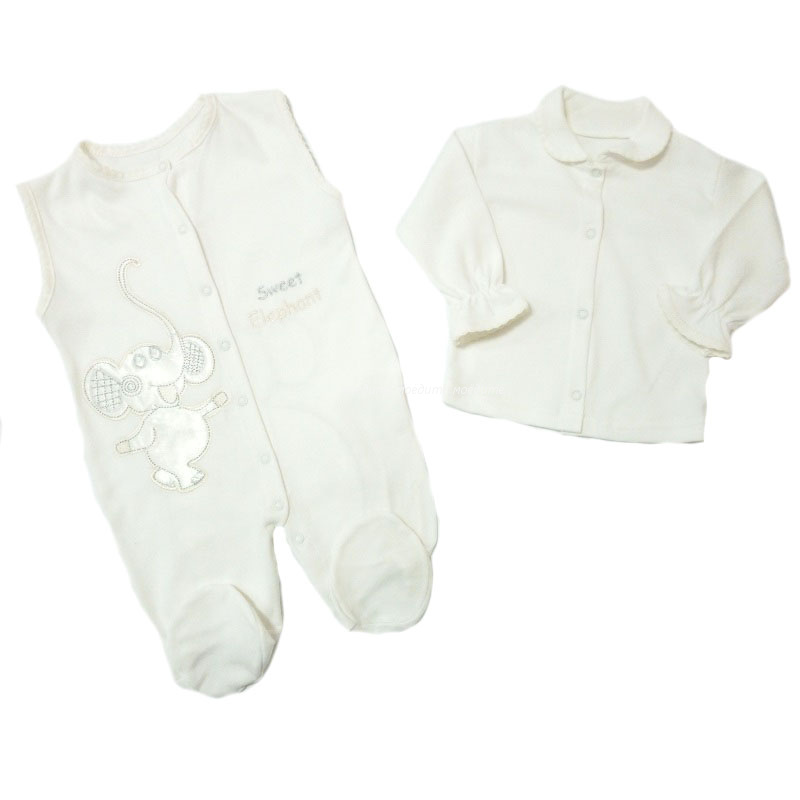 1. Полукомбинезона с закрытыми ножками, спереди и между ножек на кнопочках. Комбинезон украшен спереди и сзади аппликацией в виде слонёнка.